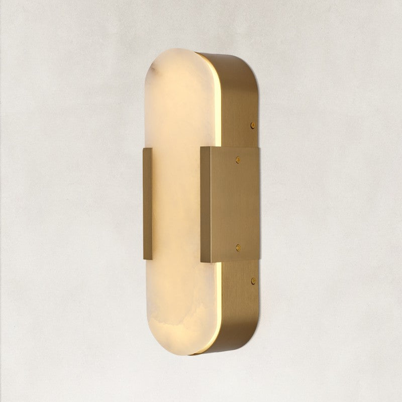 The Velo Wall Sconce pairs a curved metal frame with a smooth alabaster diffuser, blending modern precision with timeless materiality. Its soft illumination and sculptural form make it ideal for accenting corridors, living rooms, or bedside spaces with understated elegance.