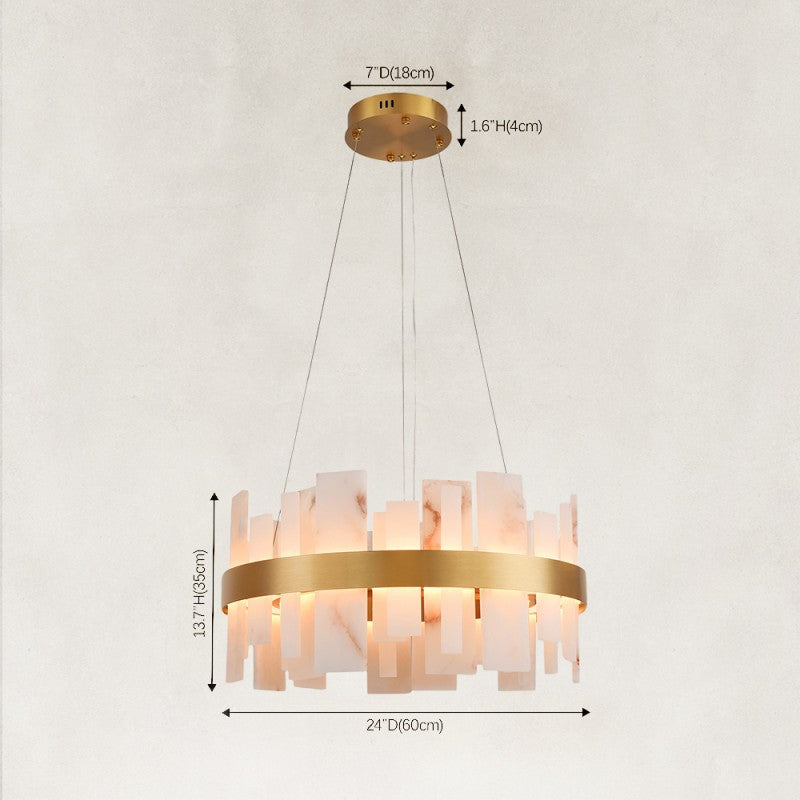 • Hand-cut Spanish alabaster panels create a soft, ambient halo glow.